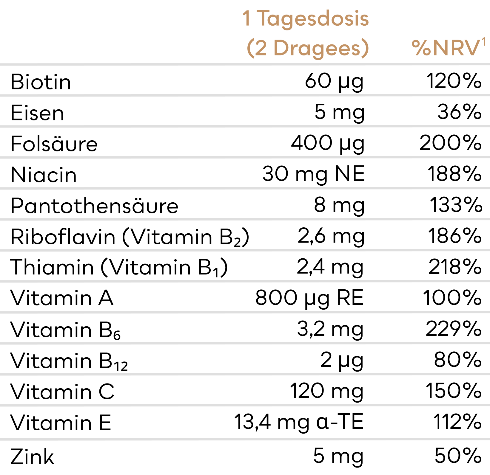Füllstoff: Laktose; Saccharose; Trennmittel: Talkum; L-Ascorbinsäure (Vitamin C); Füllstoff: Mikrokristalline Cellulose; Nicotinamid (Niacin); Füllstoff: Gummi Arabicum; DL-alpha-Tocopherylacetat (Vitamin E); Eisenfumarat; Öl, pflanzlich (Palmöl); Farbstoff: Calciumcarbonat; Calcium-D-Pantothenat (Pantothensäure); Füllstoff: Mannitol; Modifizierte Stärke; Zinkoxid; Maisstärke; Pyridoxinhydrochlorid (Vitamin B6); Trennmittel: Magnesiumsalz der Speisefettsäure; Glucosesirup; Thiaminmononitrat (Vitamin B1); Riboflavin (Vitamin B2); Trennmittel: Siliciumdioxid; Gelatine (Schwein); Retinylacetat (Vitamin A); Pteroylmonoglutaminsäure (Folsäure); Überzugsmittel: Bienenwachs, Carnaubawachs; D-Biotin; Farbstoffe: Eisenoxid rot, Indigotin blau; Cyanocobalamin (Vitamin B12).